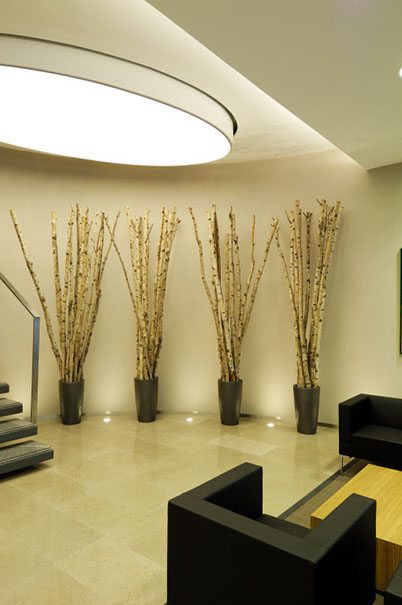 Nov poslovni objekt je premišljeno postavljen v zeleno oazo sredi industrijskih hal. Igrive krošnje obstoječih dreves diskretno dopolnjujejo minimalistično zasnovano arhitekturo.